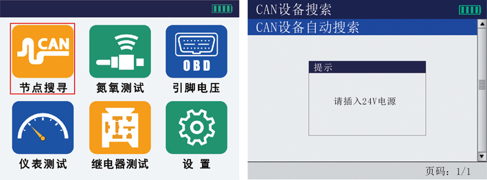 注意:请确认氮氧传感器供电为24V/12V,选择错误会损坏氮氧传感器,如未接电源会提示:请插入24V电源。